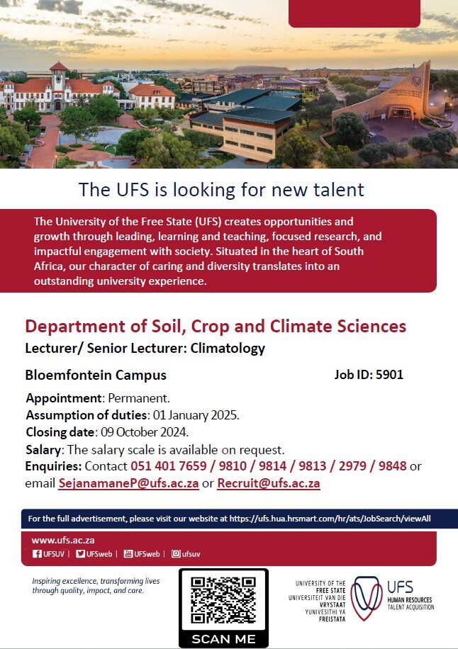 The University of the Free State is seeking a lecturer in Climatology at their Department of Soil, Crop and Climate Sciences.